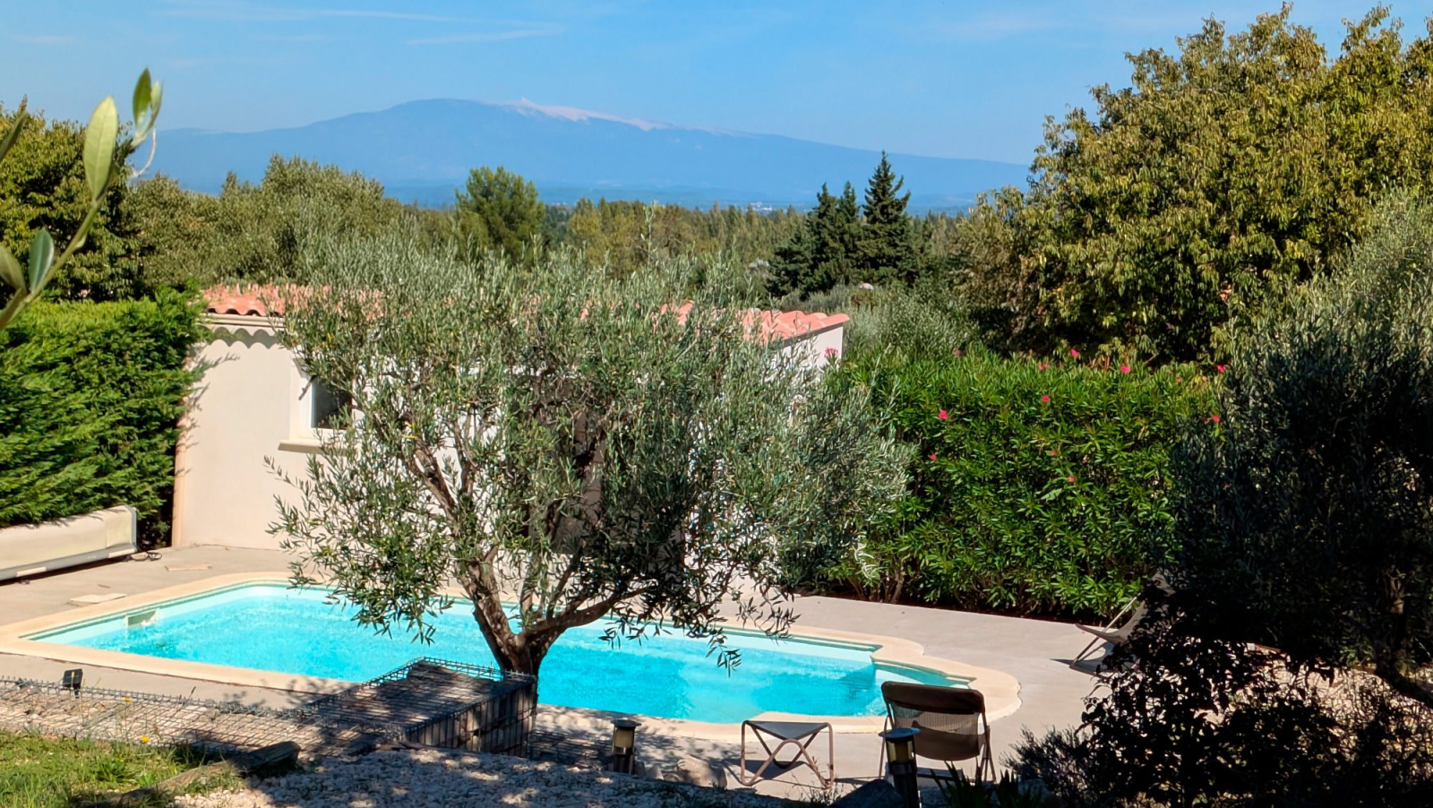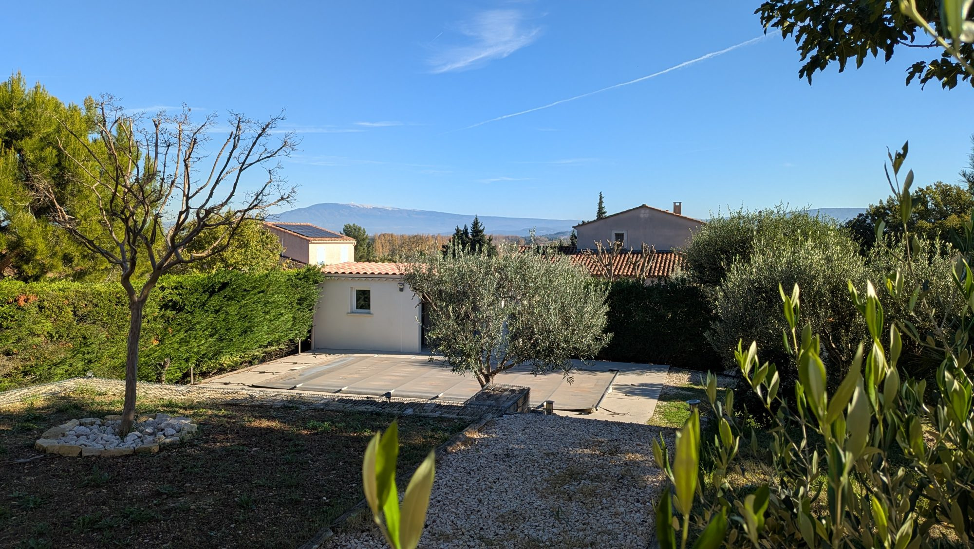 Le jardin, entièrement clos et soigneusement aménagé, invite à la détente avec sa piscine bordée d'oliviers, sa terrasse couverte équipée d'une pergola bioclimatique et ses différents espaces extérieurs propices à la convivialité. La vue dégagée sur le Mont Ventoux apporte une touche unique à cet ensemble harmonieux.